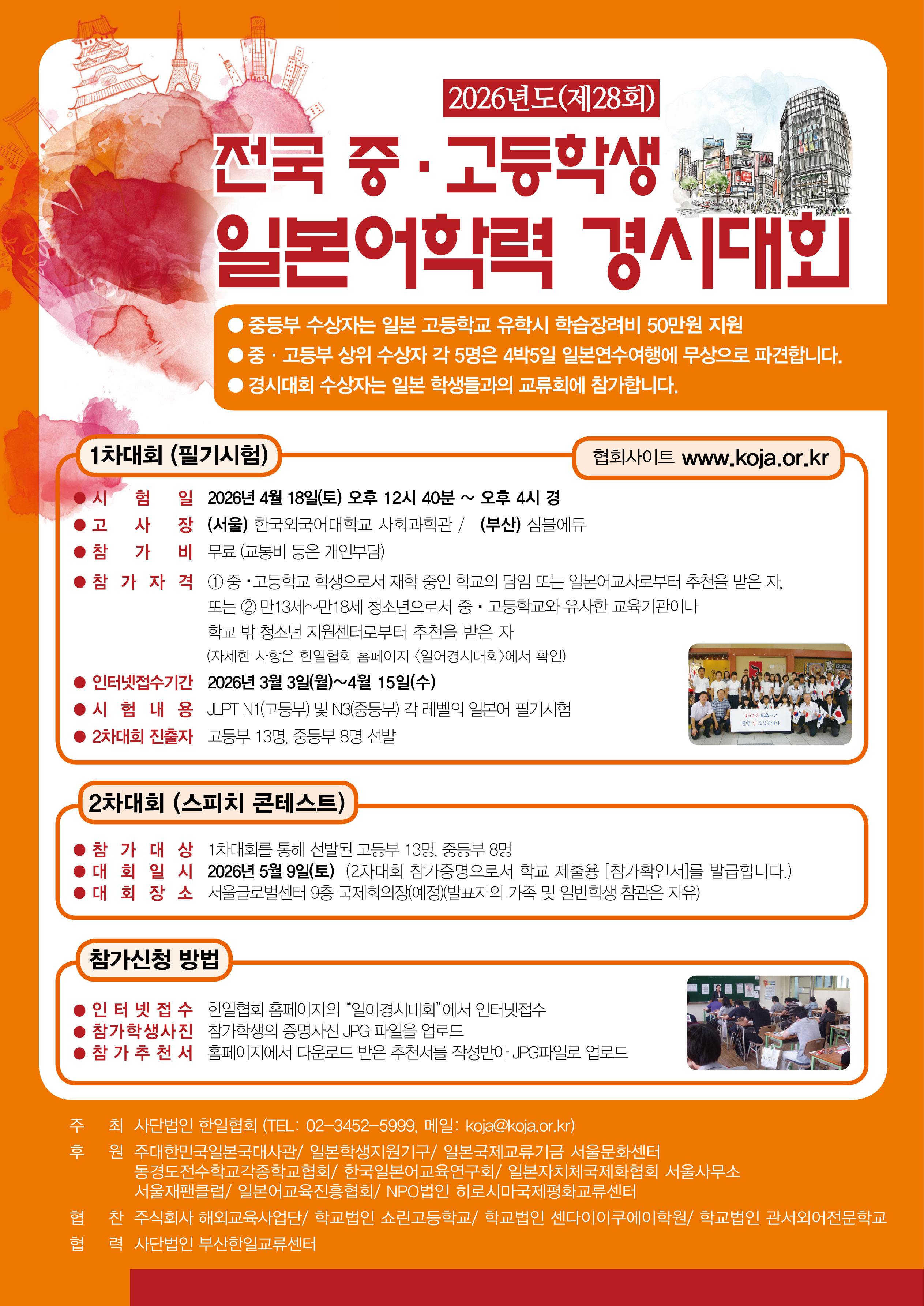 º» Çùȸ´Â ±¹³» Áß¡¤°íµîÇб³¿¡¼ ÀϺ»¾î¸¦ ¹è¿ì°í ÀÖ´Â ÇлýÀ» ´ë»óÀ¸·Î ÀϺ»¾î ÇнÀ ´É·ÂÀ» °Ü·ç°Ô ÇÔÀ¸·Î½á ÀϺ»¾î ÇнÀ ÀÇ¿åÀ» °íÃë½Ã۸ç, ´ëȸ¸¦ ÅëÇÏ¿© ÀÔ»óÇѼö»óÀÚ·Î ÇÏ¿©±Ý ÇÑÀÏ ¾ç±¹ÀÇ Ã»¼Ò³â ±³·ù¸¦ ÅëÇØ¼ ±Û·Î¹ú ½Ã´ë¸¦ ¸®µåÇÏ´Â ÀÎÀ縦 À°¼ºÇÏ´Â °ÍÀ»¸ñÀûÀ¸·Î Ç¥Á¦ÀÇ ´ëȸ¸¦ ½Ç½ÃÇÕ´Ï´Ù. ¿©·¯ºÐÀÇ ¸¹Àº Âü¿© ºÎʵ右´Ï´Ù. <1Â÷´ëȸ (Çʱâ½ÃÇè) > ¡Ü½ÃÇèÀÏ :2026³â 4¿ù 18ÀÏ(Åä) ¿ÀÈÄ12:20~ ¿ÀÈÄ4:00°æ ¡Ü°í»çÀå : (¼¿ï) Çѱ¹¿Ü±¹¾î´ëÇб³/ (ºÎ»ê) ºÎ»ê½Éºí¿¡µà ¡ÜÂü°¡ºñ : ¹«·á ¡ÜÂü°¡ÀÚ°Ý ¨ç (1) Áß∙°íµîÇб³ÇлýÀ¸·Î¼ ÀçÇÐÁßÀÎ Çб³ÀÇ ´ãÀÓ ¶Ç´Â ÀϺ»¾î ±³»ç·ÎºÎÅÍ ÃßõÀ» ¹ÞÀº ÀÚ. ¶Ç´Â (2) ¸¸13¼¼ ÀÌ»ó ¸¸18¼¼ ÀÌÇÏÀÇ Ã»¼Ò³âÀ¸·Î¼ Áß∙°íµîÇб³¿Í À¯»çÇÑ ±³À°±â°üÀ̳ª, Çб³¹Û û¼Ò³âÁö¿ø¼¾ÅͷκÎÅÍ ÃßõÀ» ¹ÞÀº ÀÚ ¨è ¼ö»óÀڷμ ÀϺ» ¿¬¼ö ´ë»óÀÚ¿¡ ¼±¹ßµÉ °æ¿ì, ÀϺ» ¿¬¼ö¿¡ ¹Ýµå½Ã Âü°¡ÇÒ ¼ö ÀÖ´Â ÀÚ ¨é ¸¸5¼¼ ÀÌÈÄ ÀϺ»¿¡¼Ã¼·ùÇÑ ±â°£ÀÌ ÇÕ»êÇÏ¿© 6°³¿ù ¹Ì¸¸ÀÎ ÀÚ ¡ÜÁ¢¼ö±â°£ : 2026³â 3¿ù 3ÀÏ(È) ~ 4¿ù 15ÀÏ(¼ö) ¡ÜÂü°¡½Åû ¹æ¹ý : º» ȨÆäÀÌÁöÀÇ °æ½Ã´ëȸ½Ç½Ã¿ä° ÆäÀÌÁö¿¡¼ <ÀÎÅͳÝÁ¢¼ö>·Î Á¢¼ÓÇÏ¿©¿Â¶óÀνÅû ¡Ü½ÃÇè³»¿ë : °íµîºÎ N1, ÁßµîºÎ N3ÀÇ ÀϺ»¾î´É·Â½ÃÇè(JLPT) ¼öÁØ ¹®Á¦ ¡Ü2Â÷´ëȸ ÁøÃâÀÚ : °íµîºÎ 13¸í, ÁßµîºÎ 8¸í¼±¹ß (³ë·Â»ó 15¸íÀº º°µµ ½Ã»ó) <2Â÷´ëȸ (½ºÇÇÄ¡ÄÜÅ×½ºÆ®) ¹× ½Ã»ó½Ä > ¡ÜÀϽà :2026³â 5¿ù 9ÀÏ(Åä) / ¿ÀÀü9:00~¿ÀÈÄ1:00°æ ¡ÜÀå¼Ò : ¼¿ï±Û·Î¹ú¼¾ÅÍ 9Ãþ ±¹Á¦È¸ÀÇÀå(¿¹Á¤) ¡ÜÀÚÀ¯Âü°ü : ¹ßÇ¥ÀÚ°¡Á· ¹× Çб³°ü°èÀÚ, ÀϹÝÀÎ µîÀº ÀÚÀ¯Âü°ü °¡´É ¡Ü½Ç½Ã¿ä°ÀÇ ÀÚ¼¼ÇÑ ³»¿ëÀº ÇÑÀÏÇùȸ ȨÆäÀÌÁö( ¹Ù·Î°¡±â )¿¡¼È®ÀÎÇϽñ⠹ٶø´Ï´Ù.